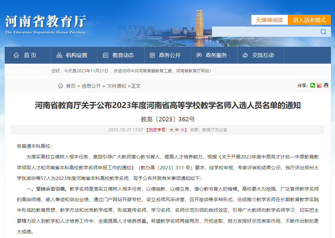 近日,河南省教育厅发布《关于公布2023年度河南省高等学校教学名师入选人员名单的通知》(教高〔2023〕362号),H动漫