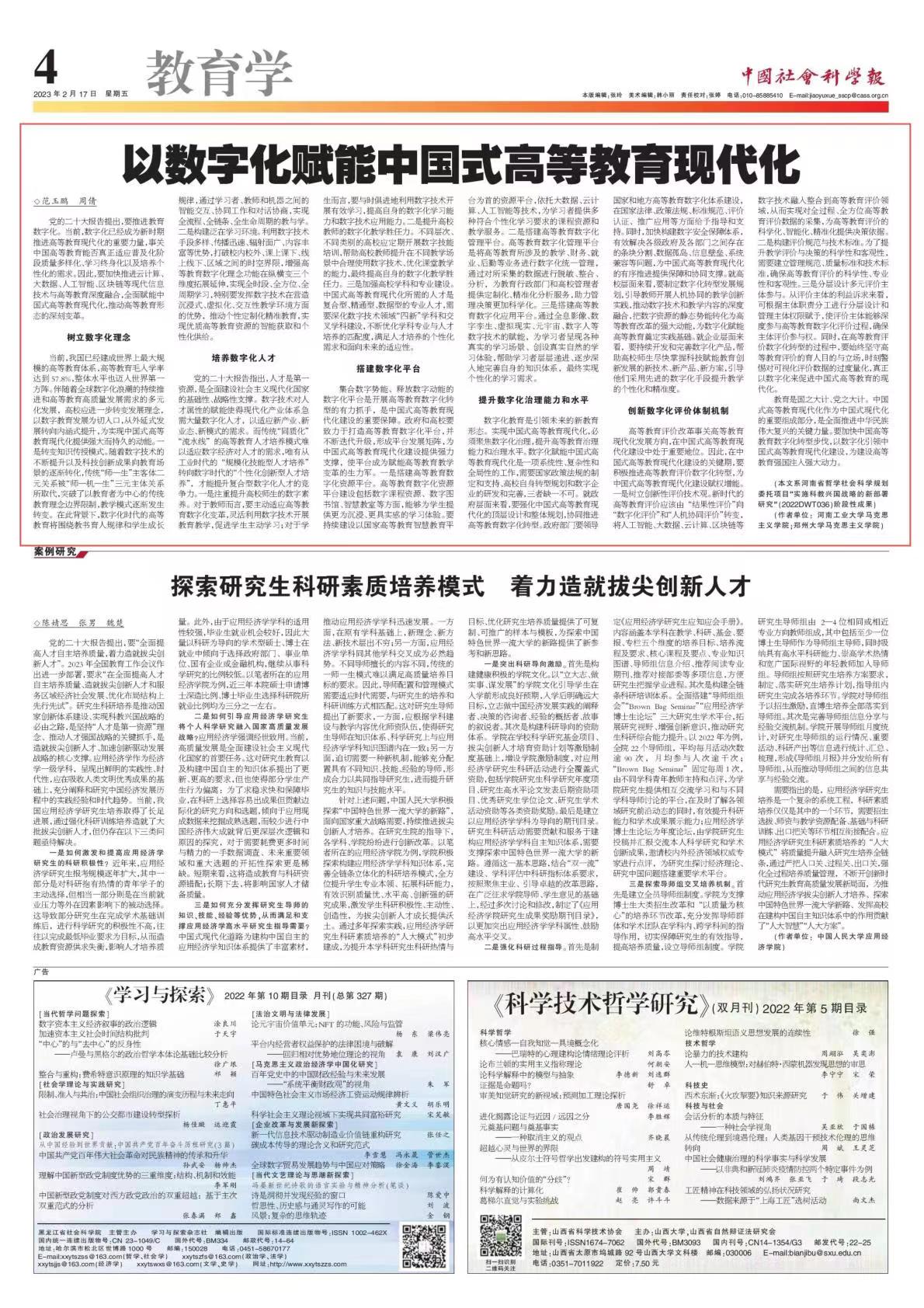 青年教师范玉鹏的理论文章《以数字化赋能中国式高等教育现代化》。文章提出数字化已经成为新时期推进高等教育现代化的重要力量,事关中国高等教育能否真正适应普及化阶段质量多样化、学习终身化以及培养个性化的需求。要加快推进云计算、大数据、人工智能、区块链等现代信息技术与高等教育深度融合,全面赋能中国式高等教育现代化,推动高等教育形态的深刻变革。文章着重从树立数字化理念、培养数字化人才、搭建数字化平台、提升数字化治理能力和水平、创新数字化评价体制机制等五个方面阐释了数字化如何赋能中国式高等教育现代化。