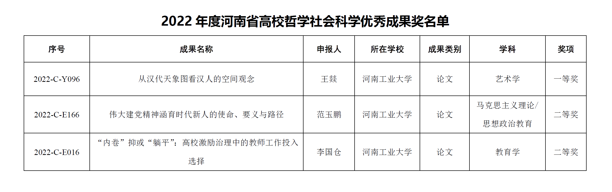 河南省高校哲学社会科学优秀成果是由河南省教育厅组织的省内级别较高的成果评奖,用以奖励在哲学社会科学研究领域作出较大贡献、具有较高学术价值或应用价值的研究成果,是衡量高校哲学社会科学发展水平和科研实力的重要标志。