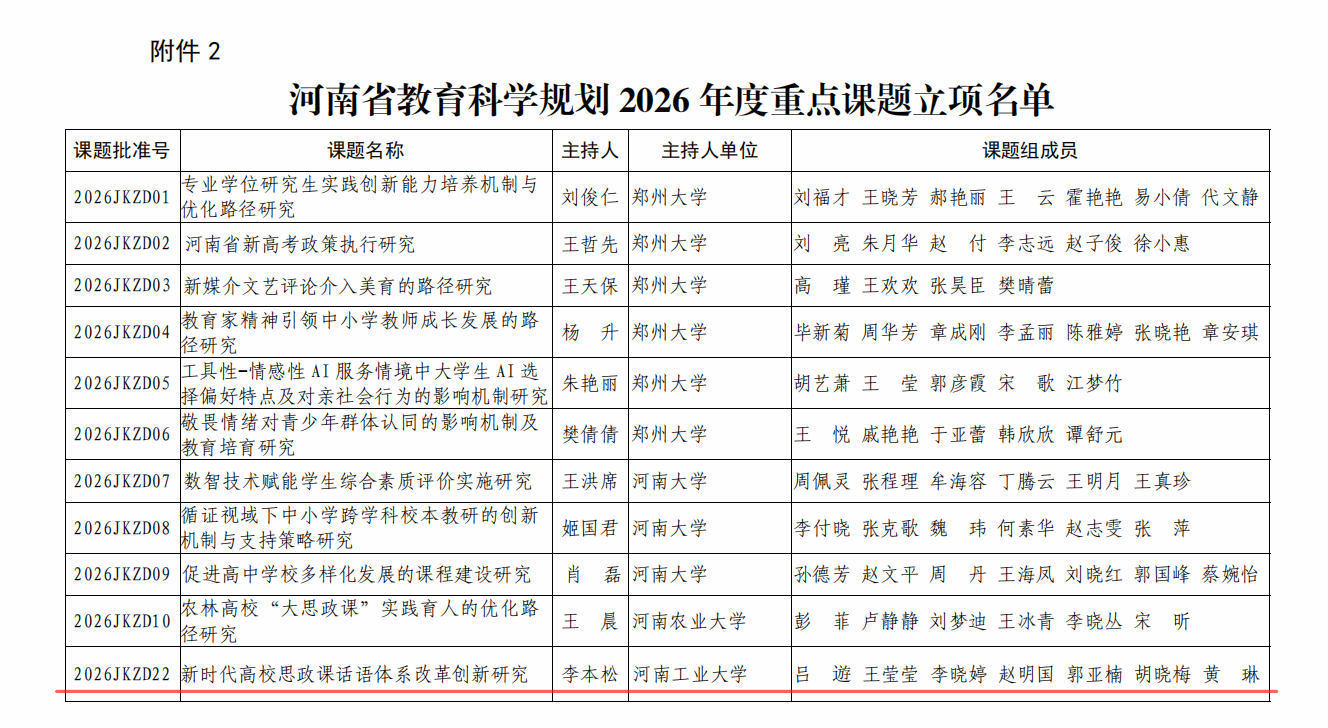 李本松教授主持的“新时代高校思政课话语体系改革创新研究”(课题批准号:2026JKZD22)成功获批河南省教育科学规划2026年度重点课题立项。