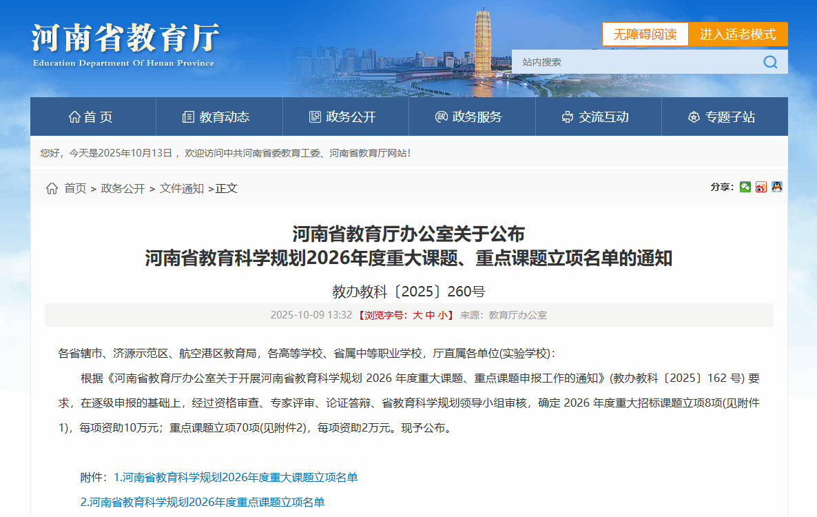 10月9日,河南省教育厅办公室正式公布了《河南省教育科学规划2026年度重大课题、重点课题立项名单的通知》,经过严格资格审查、专家评审、论证答辩及省教育科学规划领导小组审核等多轮遴选,由H动漫