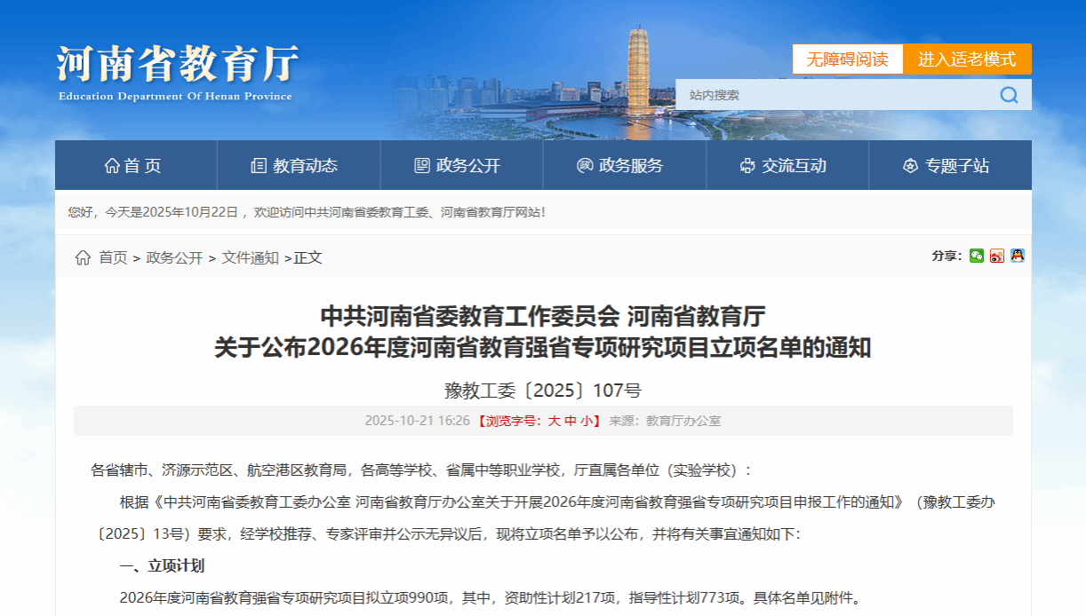 近日,中共河南省委教育工作委员会、河南省教育厅公布了《2026年度河南省教育强省专项研究项目立项名单》(豫教工委〔2025〕107号),H动漫