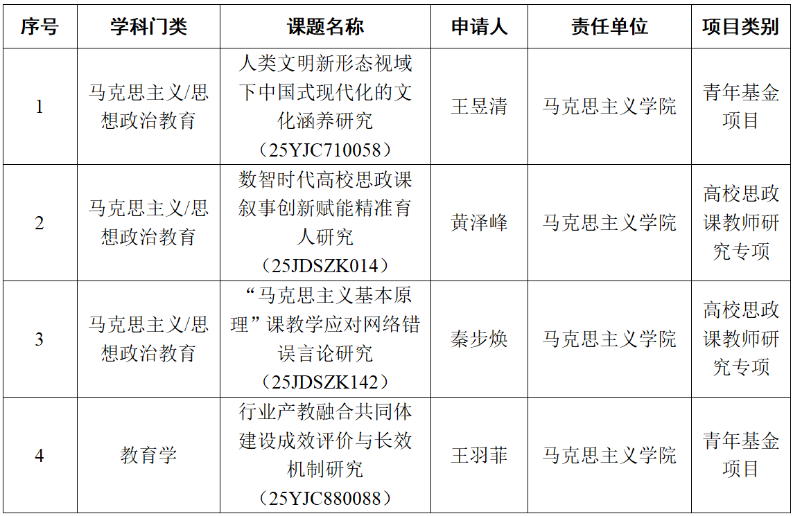 喜获4项教育部人文社会科学研究项目,其中,规划基金青年项目2项、高校思政课教师研究专项2项。具体立项情况如下: