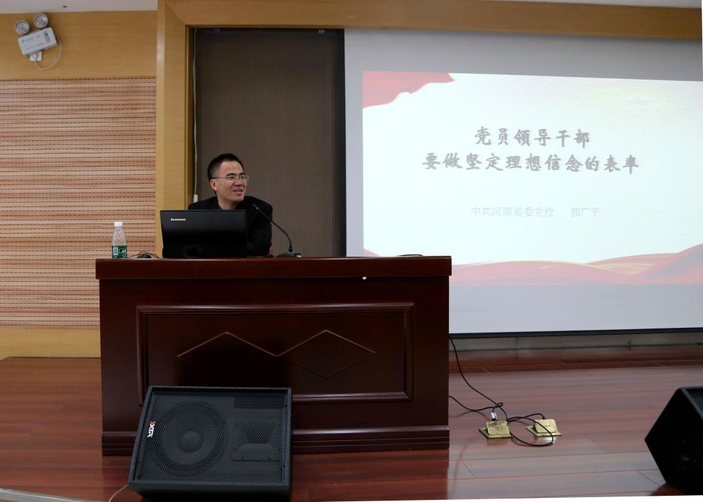 邀请,河南省委党校郭广平副教授来我校在行政楼D102做了主题为“党员干部要做坚定理想信念的表率”报告会。会议由学院副院长刘晓欣主持,H动漫